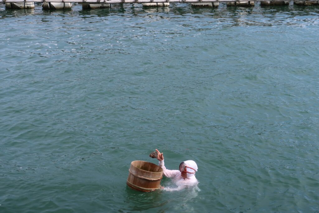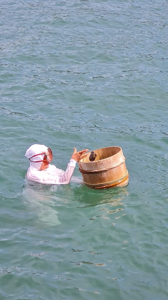 2. Encore une journée découverte pour nous. Les plongeuses en apnée ont du mérite. Ce n’est pas un travail facile. Pour votre repas les plats ainsi présentés doivent être savoureux sans oublier cette gaufre, miam miam. Continuez c’est intéressant et très culturel. Bisous à vous quatre JO et PAT